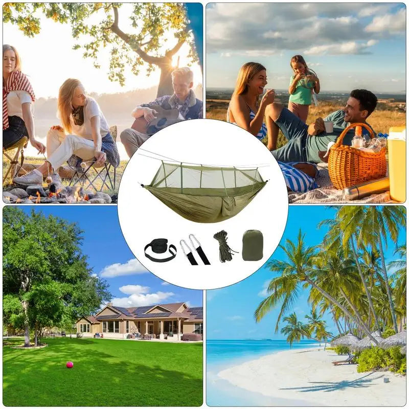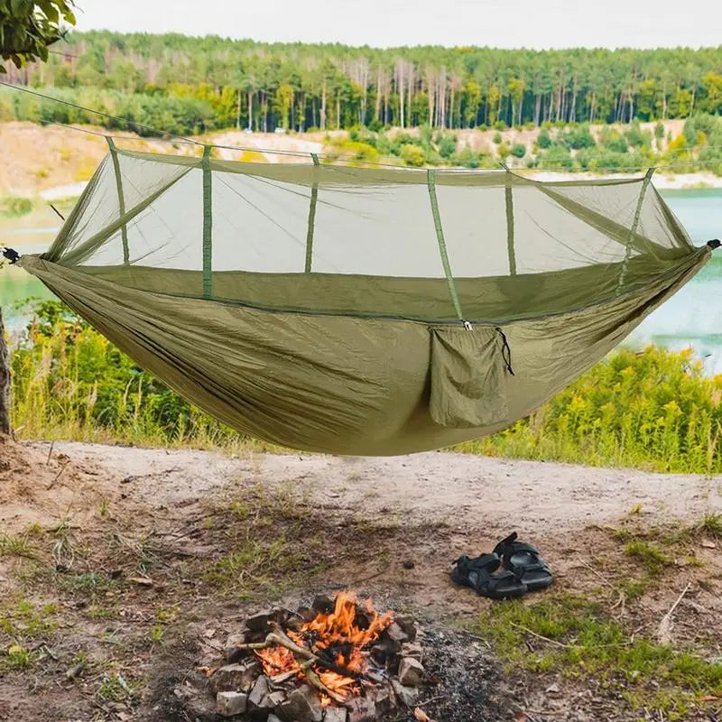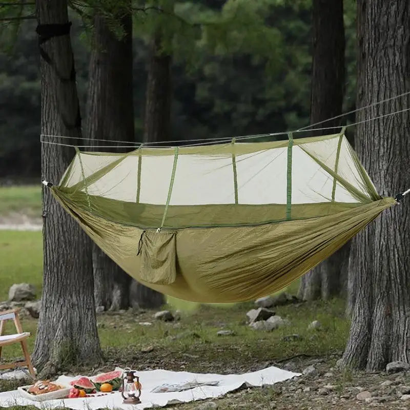 Fabriqué en nylon parachute durable, ce hamac de camping allie légèreté et résistance pour une installation facile entre deux arbres. Son filet intégré vous protège efficacement des insectes et des petits animaux, vous permettant de vous reposer en toute tranquillité.