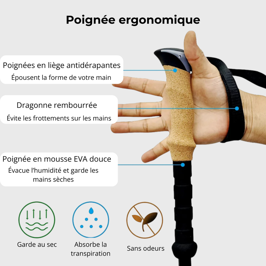 L’embout en tungstène améliore l’adhérence pour marcher plus stable sur sentiers, pierres, terre et chemins irréguliers.