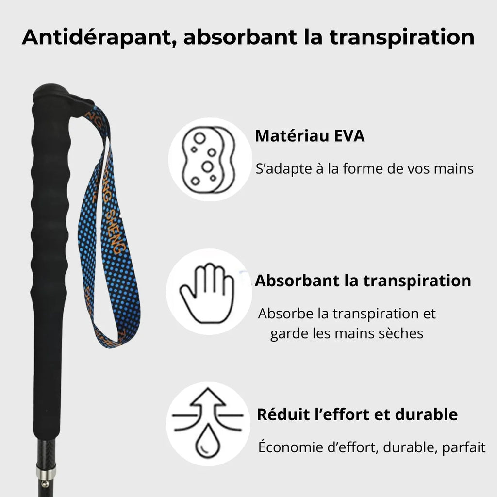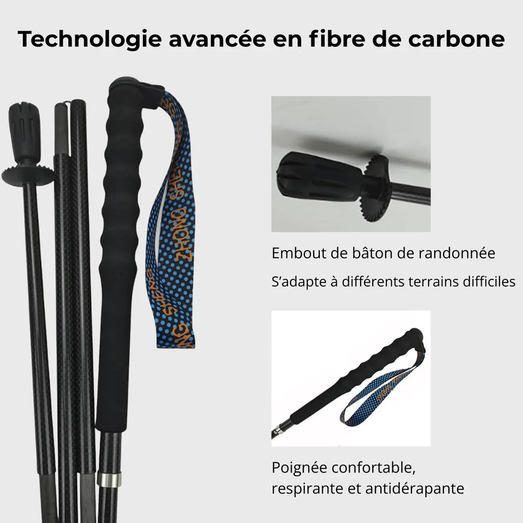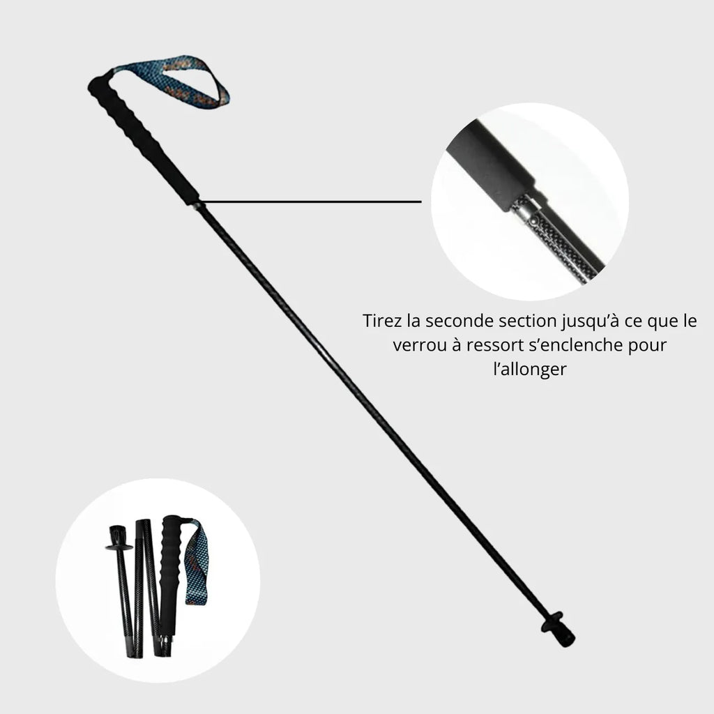 Designed for demanding outings, these folding trekking poles offer reliable support both uphill and downhill. Their carbon fiber shaft helps absorb vibrations and reduce fatigue , while their foldable design makes them easy to carry in a bag.