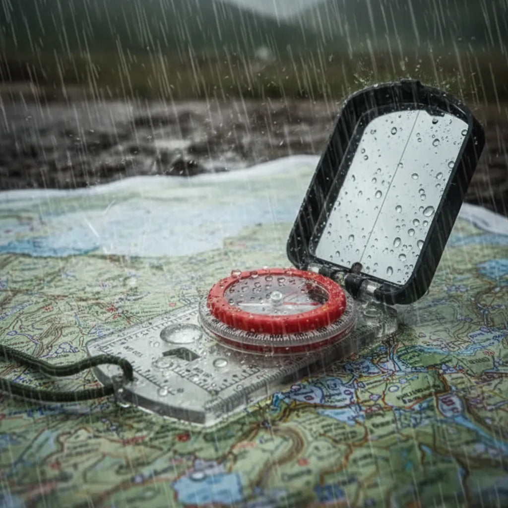 Clinometer + adjustable declination + scales for true outdoor navigation.