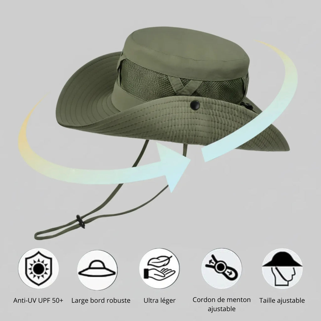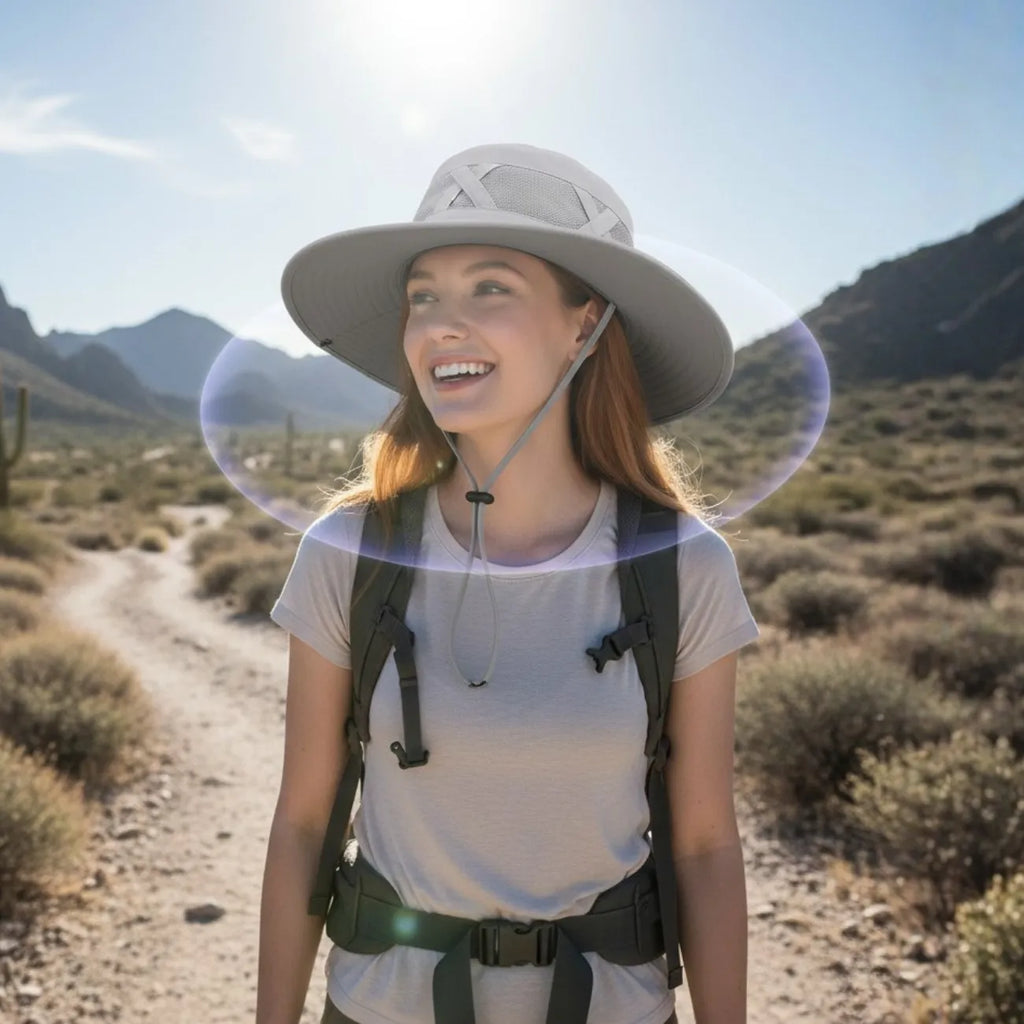 Cowboy-style hiking hat, wide brim, UPF 50+ UV protection, lightweight and waterproof