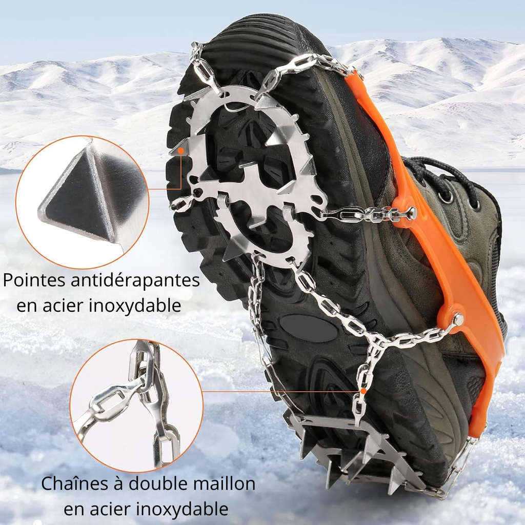 Les pointes en acier inoxydable et les chaînes assurent une traction puissante sur les routes verglacées, la neige compacte et les chemins glissants.