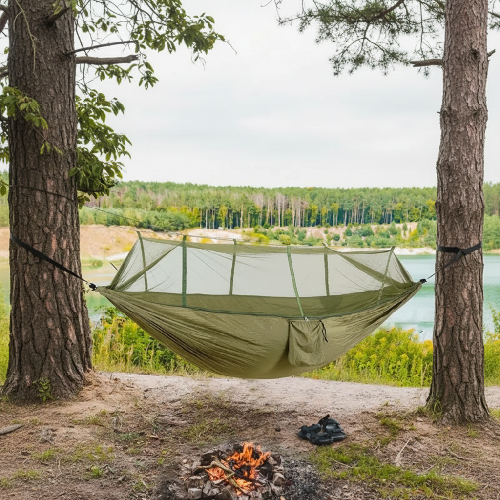 Hamac-tente spacieux pour une ou deux personnes, idéal pour la détente en extérieur.