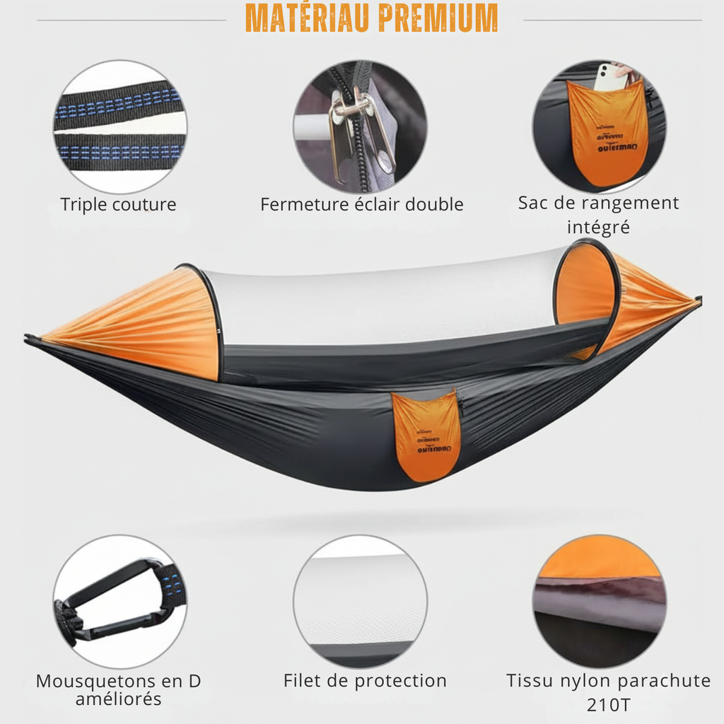 Hamac-tente spacieux pour une ou deux personnes, idéal pour la détente en extérieur.