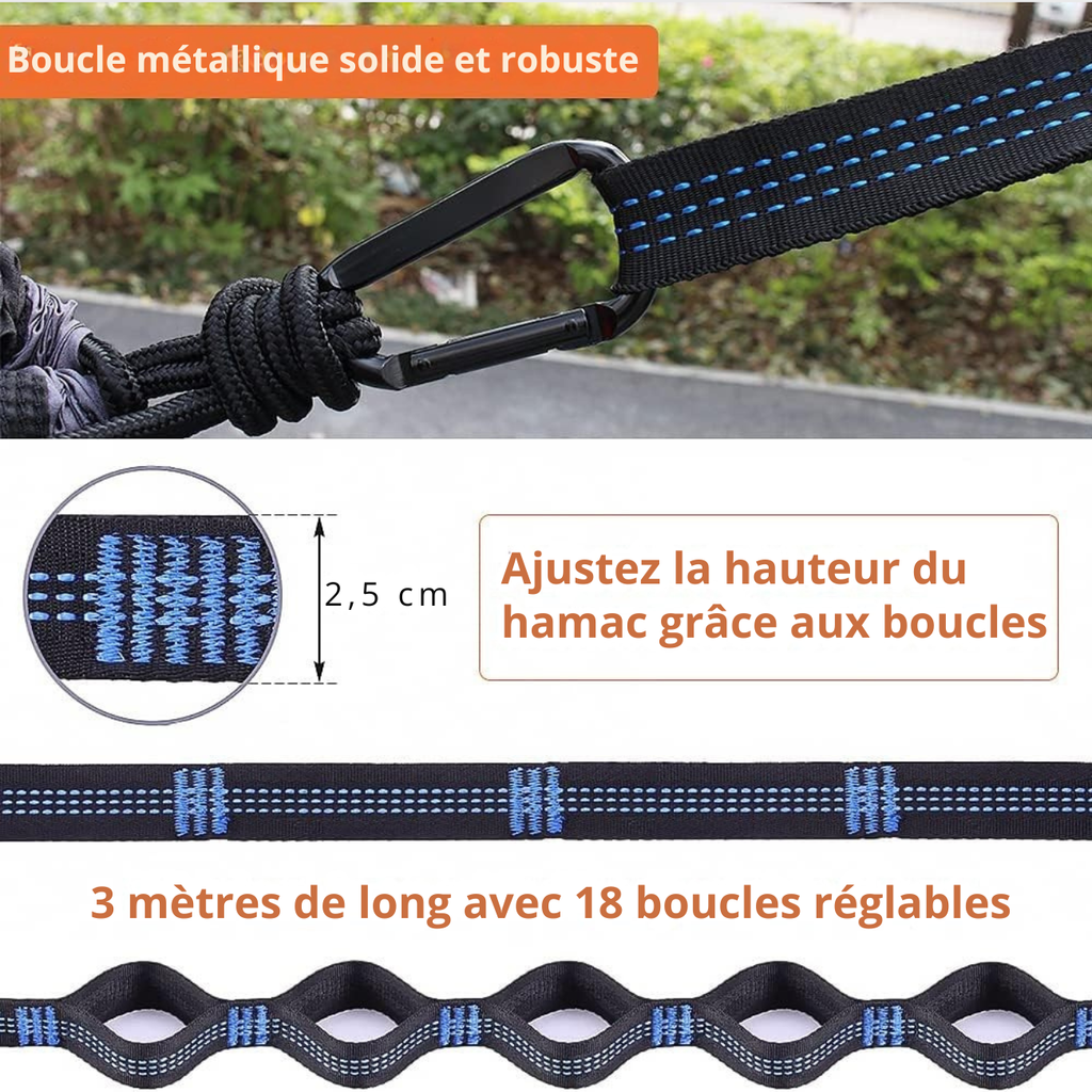 Se suspend en quelques secondes entre deux arbres, sans effort.