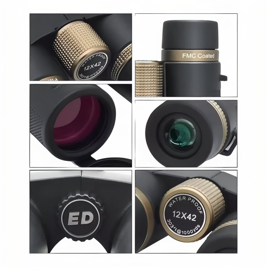 Grossissement 12x et objectifs 42 mm dans un format compact : emportez-les partout sans vous alourdir.