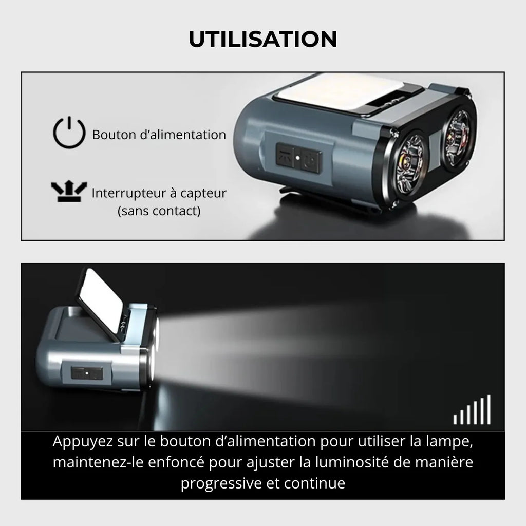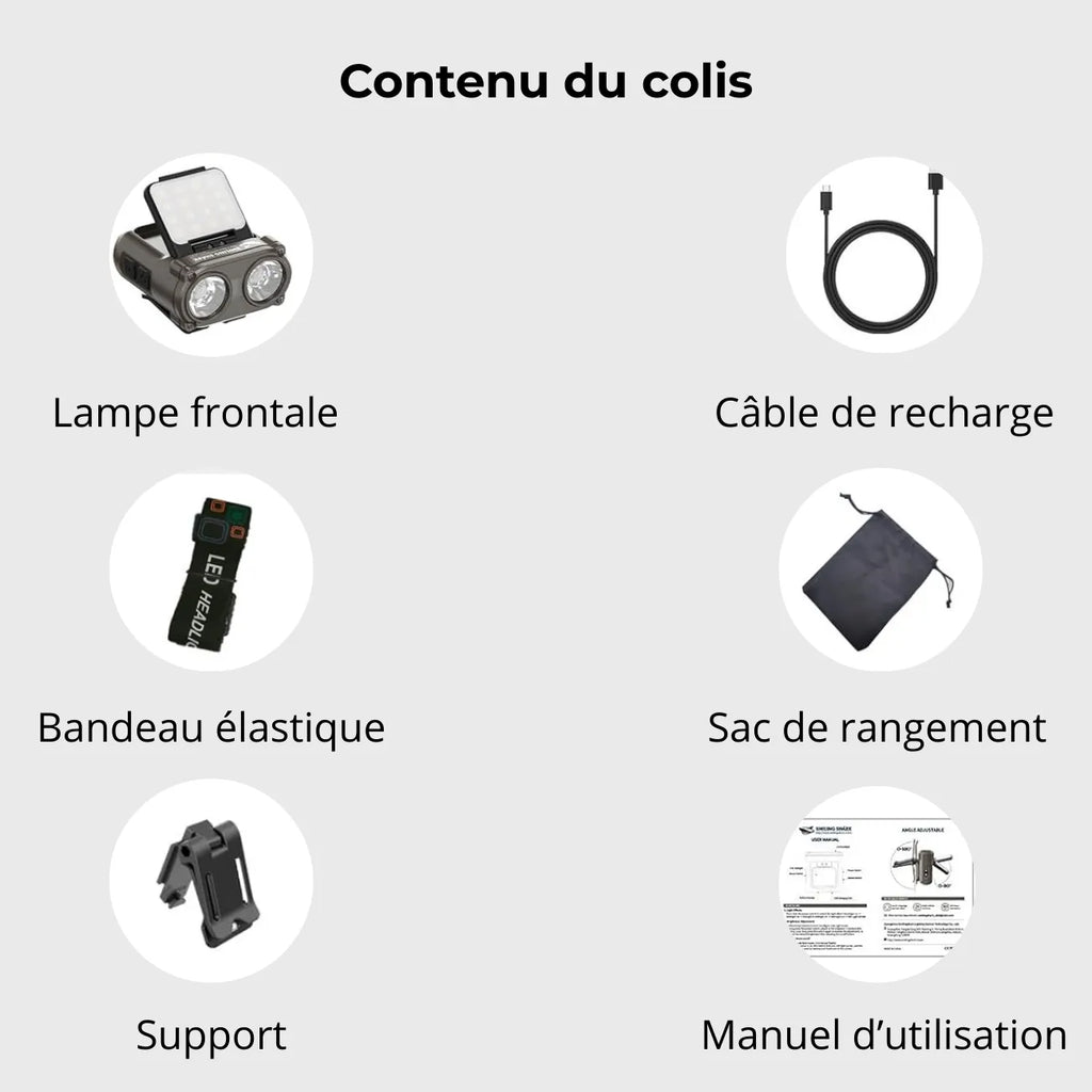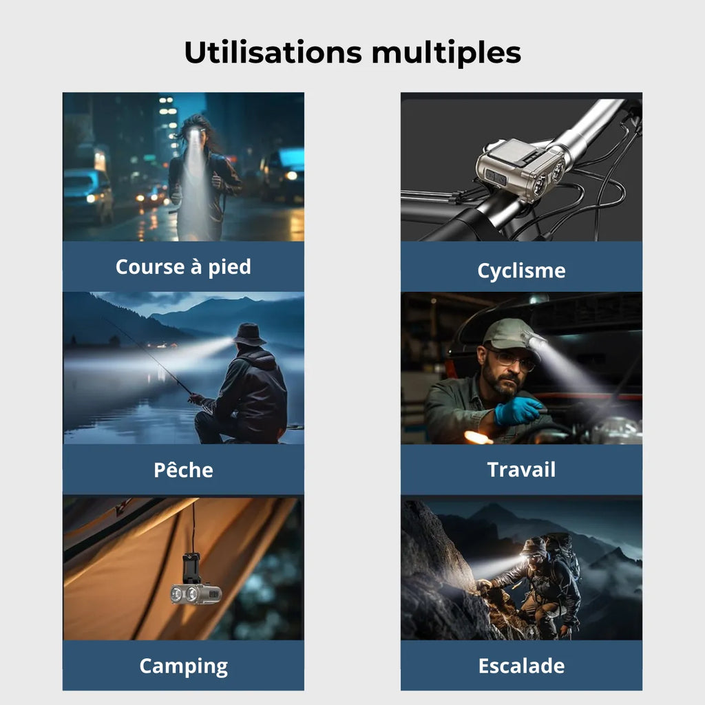 Designed for hiking , trail running, cycling, and camping, this LED headlamp combines power, comfort, and ease of use. With its 5 lighting modes , gesture sensor , and 180° adjustable angle , it allows you to see perfectly without having to lower your head, even in the rain thanks to its IPX5 protection.