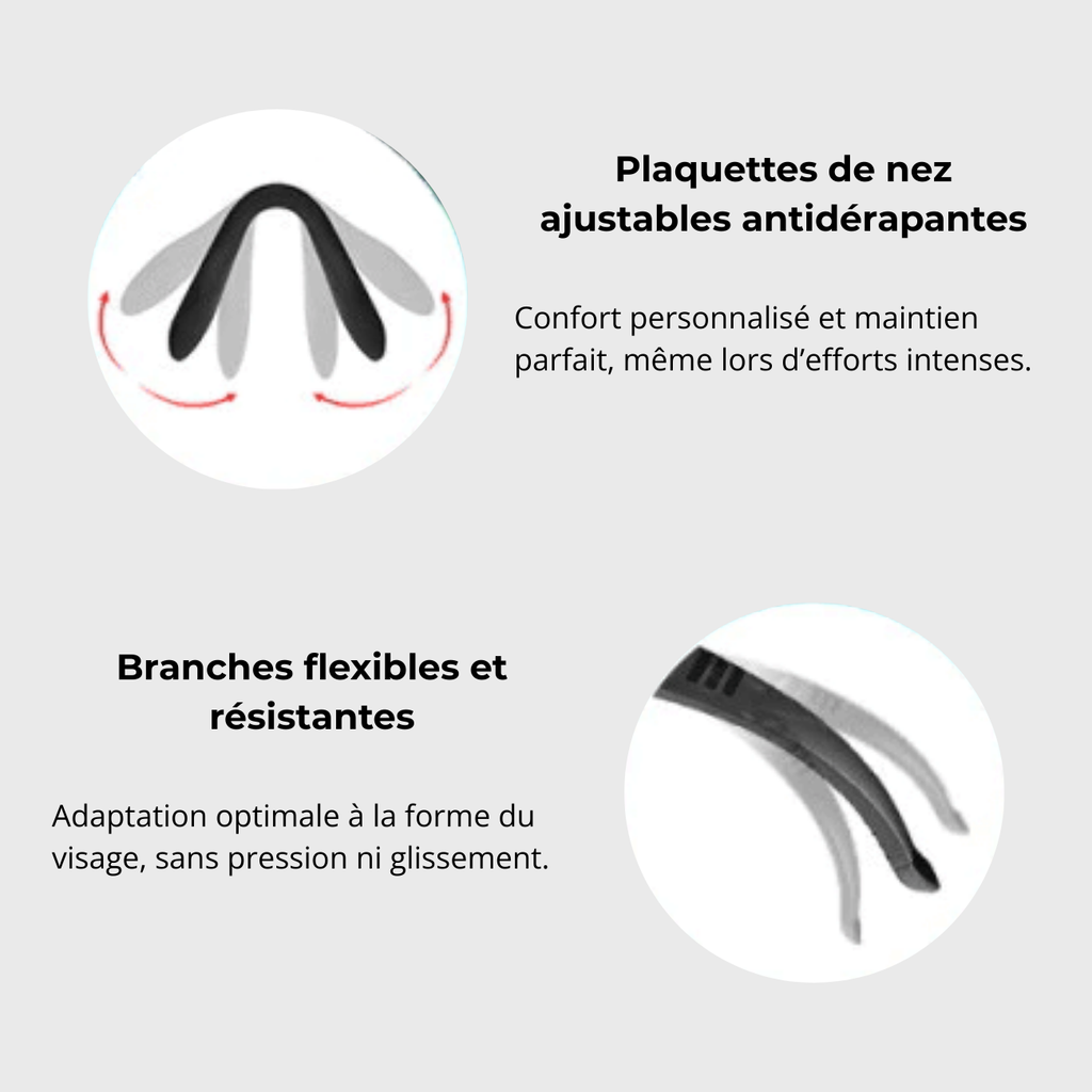Zones antidérapantes au nez et aux tempes pour une stabilité parfaite en mouvement.