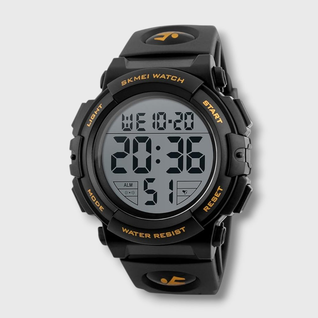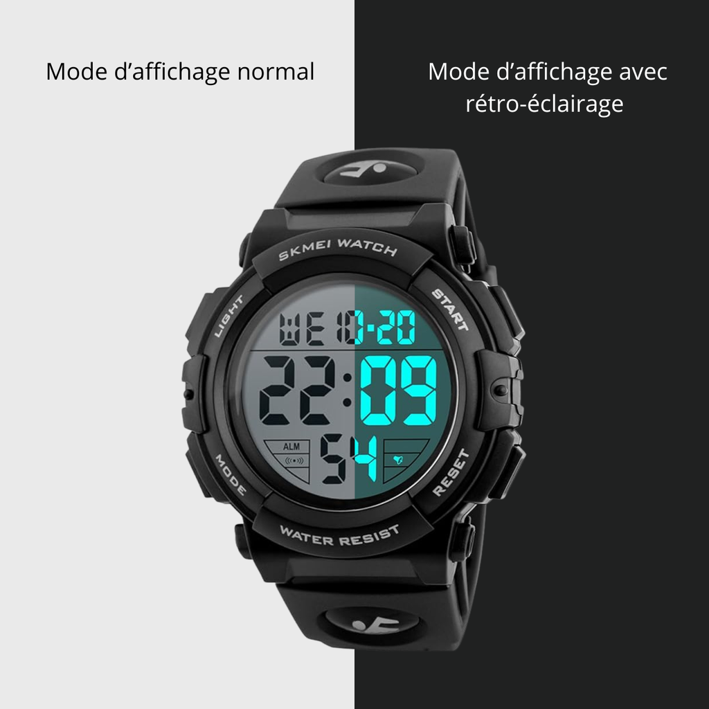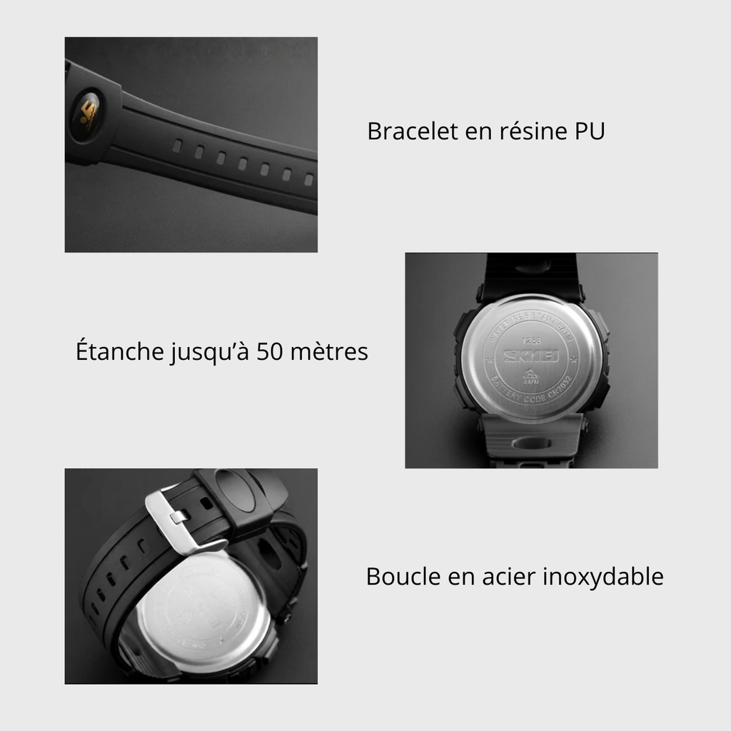 Chronomètre, alarme, date automatique et mode militaire 24 h : tout ce qu’il faut pour un usage sportif et quotidien.