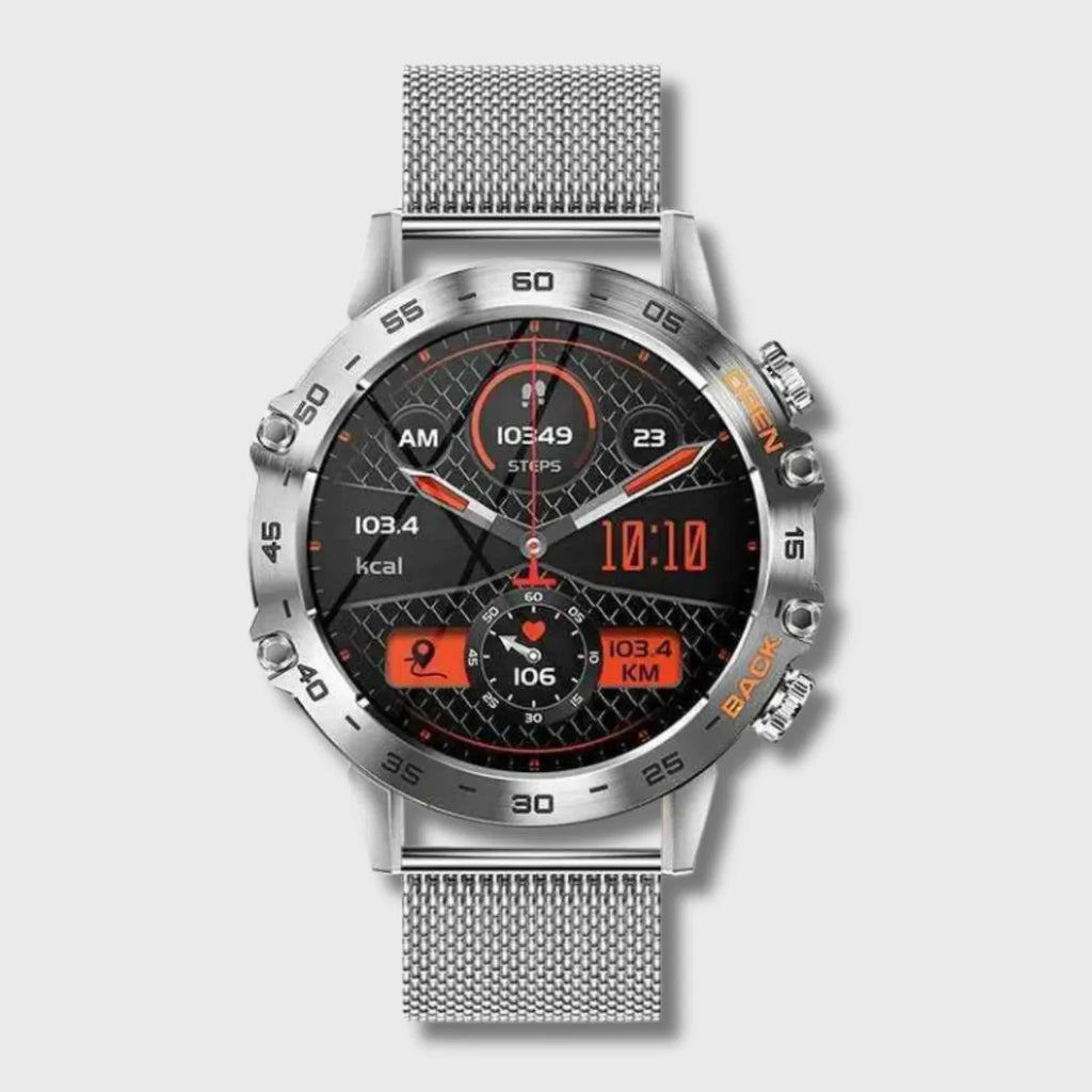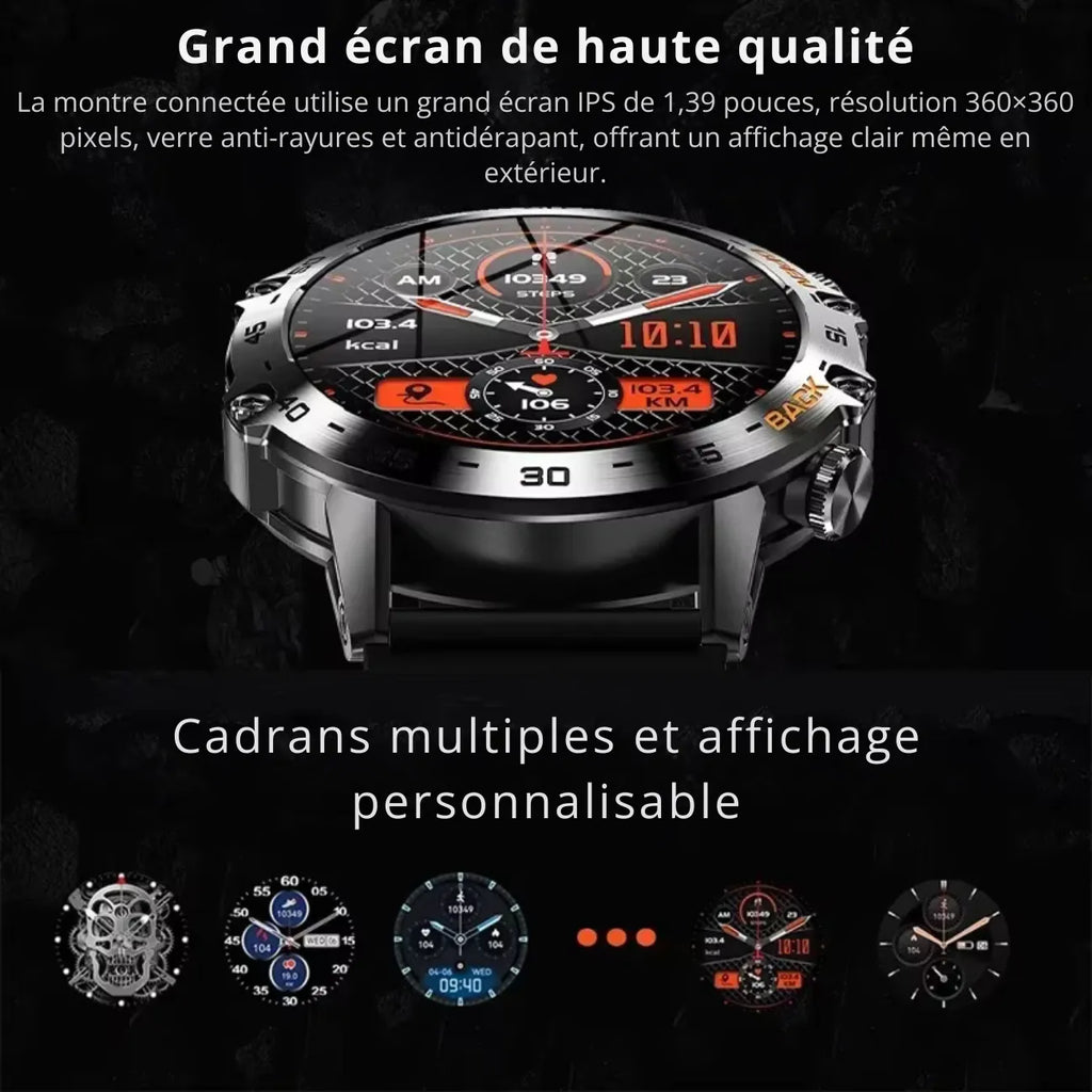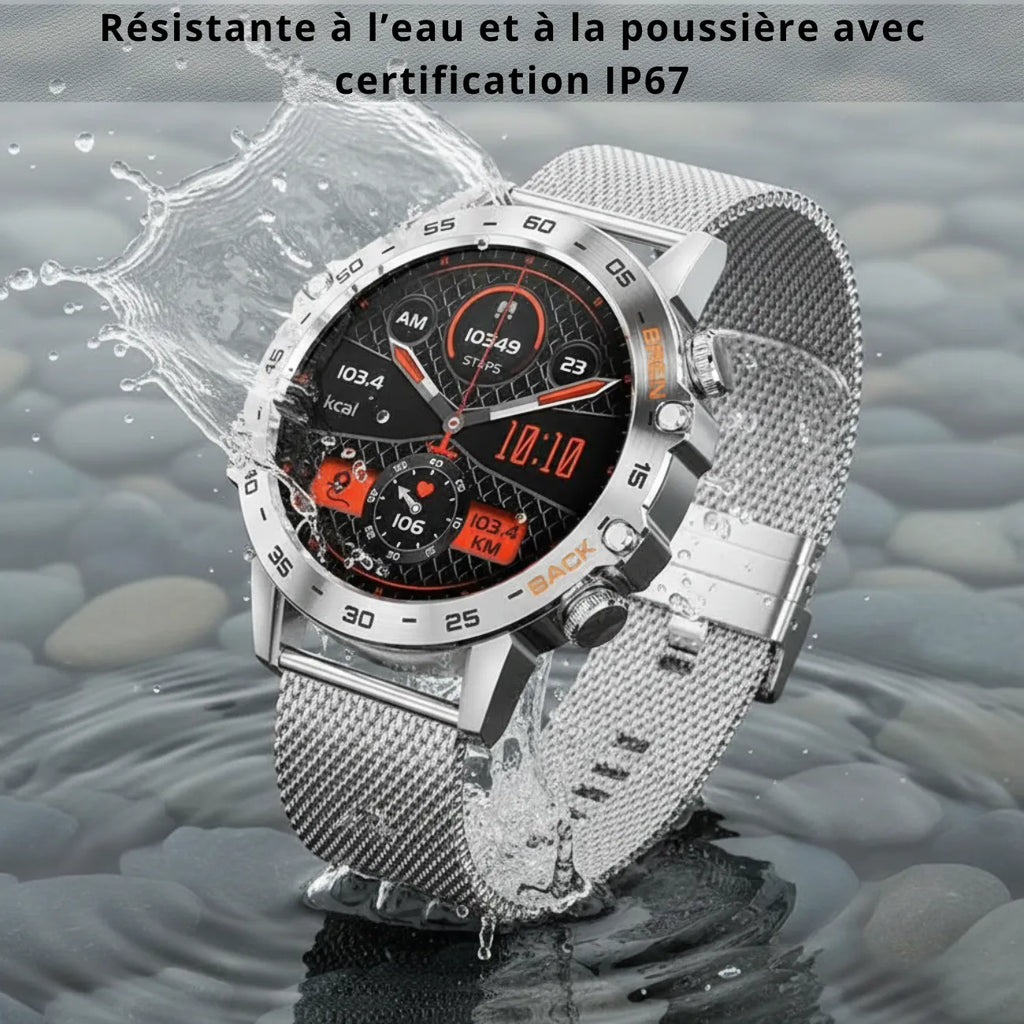 Equipped with an advanced fitness tracker , it monitors your blood pressure and heart rate in real time.