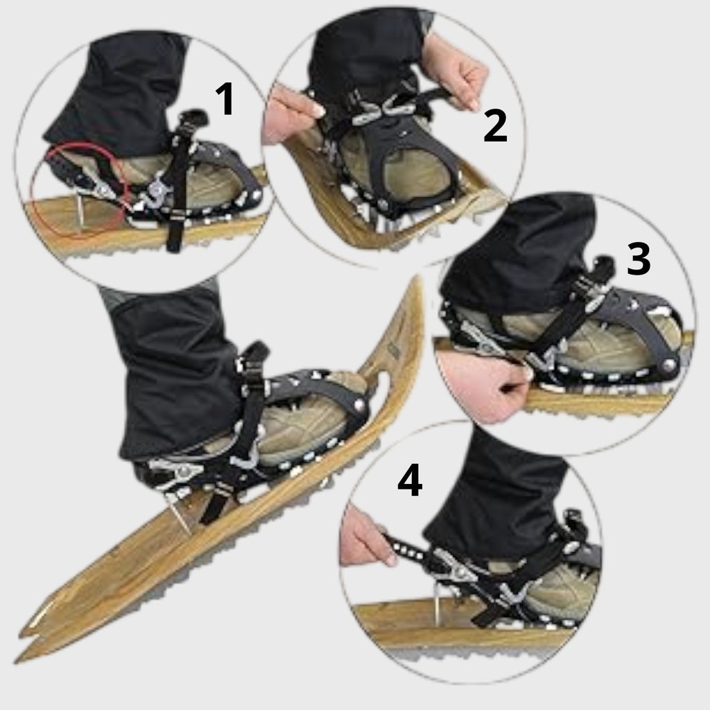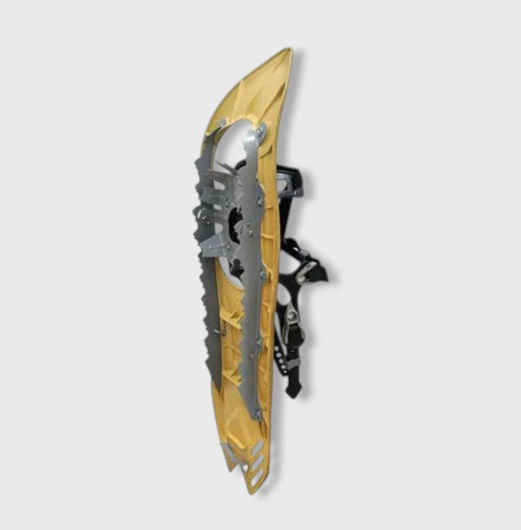 Équipées de griffes avant et rails latéraux en acier au carbone, ces raquettes assurent une excellente traction sur neige compacte et terrains enneigés.