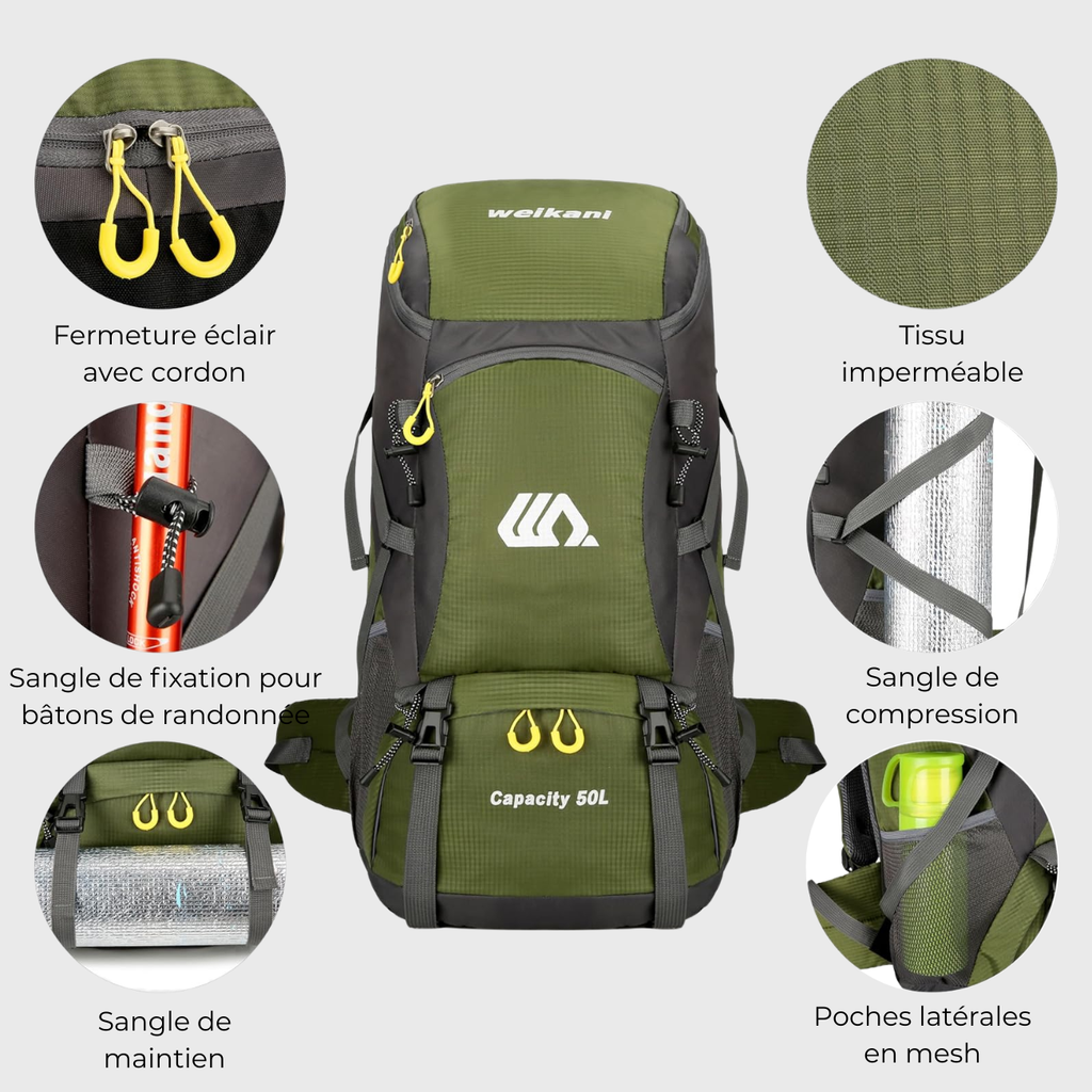 Sac à Dos Randonnée 50L - Léger, imperméable & confortable pour trekking et aventure