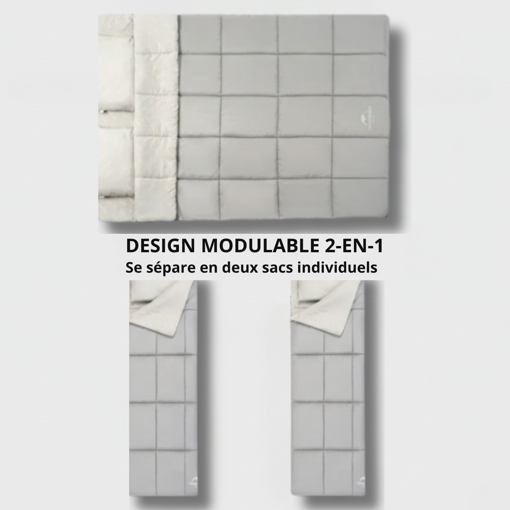 S’utilise en double ou séparé en deux sacs individuels, avec deux oreillers inclus.
