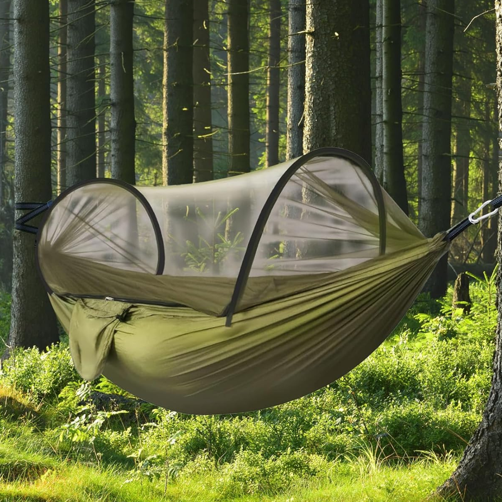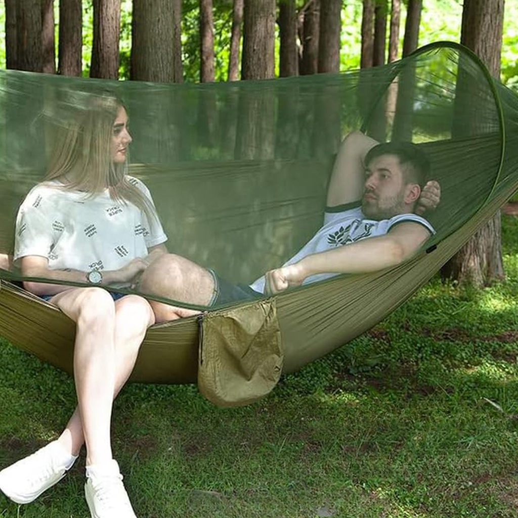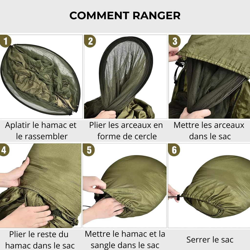Grâce aux sangles haute résistance et à la moustiquaire auto-déployante, vous installez votre espace de repos en quelques secondes.